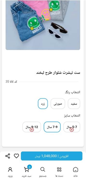 مرحله دوم : دکمه خرید در این حالت غیر فعال است ابتدا باید ویژگی های مورد نظر محصول را انتخاب کنیم و سپس دکمه افزودن به سبد خرید فعال میشود