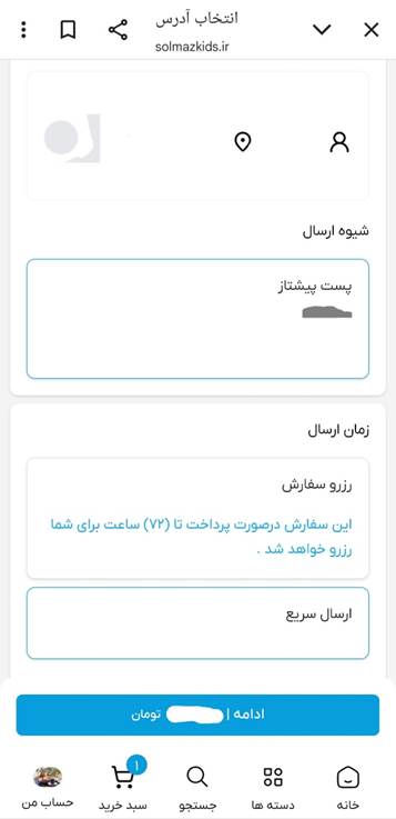 مرحله هفتم : با ثبت و انتخاب آدرس گزینه ادامه خرید را زده و سپس وارد درگاه بانکی میشوید